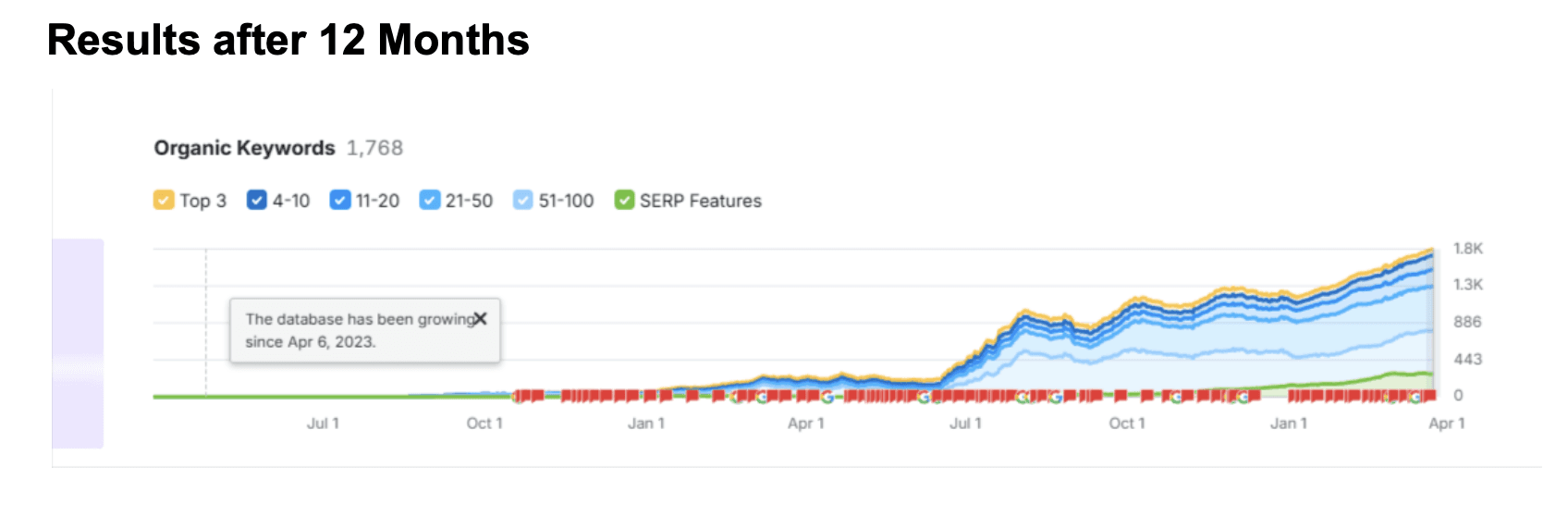 Over the course of 12 months, we helped transform their presence in search. The brand’s tracked keywords surged from 159 to 1,729 — a +987% increase. Page 1 rankings (positions 4–10) grew by 715%, while Page 2 rankings exploded by 1,450%. Mid-tier (21–50) and longtail (51–100) rankings increased by 2,788% and 687%, respectively. SERP feature appearances jumped from 11 to 285 — up by over 2,490%.