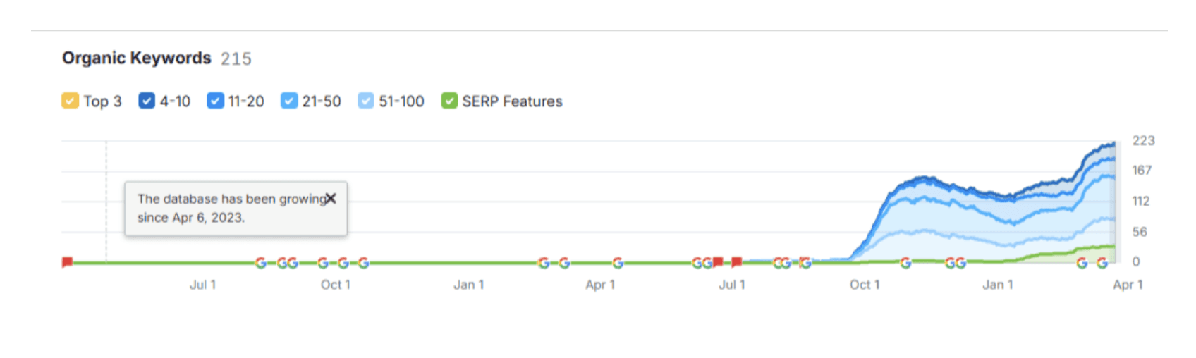 By April 2025, organic keyword rankings had exploded by over 1,060%. The brand went from 0 to 28 keywords on Page 1, 36 on Page 2, and 105 in mid-tier rankings (positions 21–50). Even longtail visibility improved dramatically, with 66 keywords ranking between positions 51–100. In addition, SERP feature appearances (such as FAQs and snippets) increased from 1 to 32 — expanding visibility across the results page.